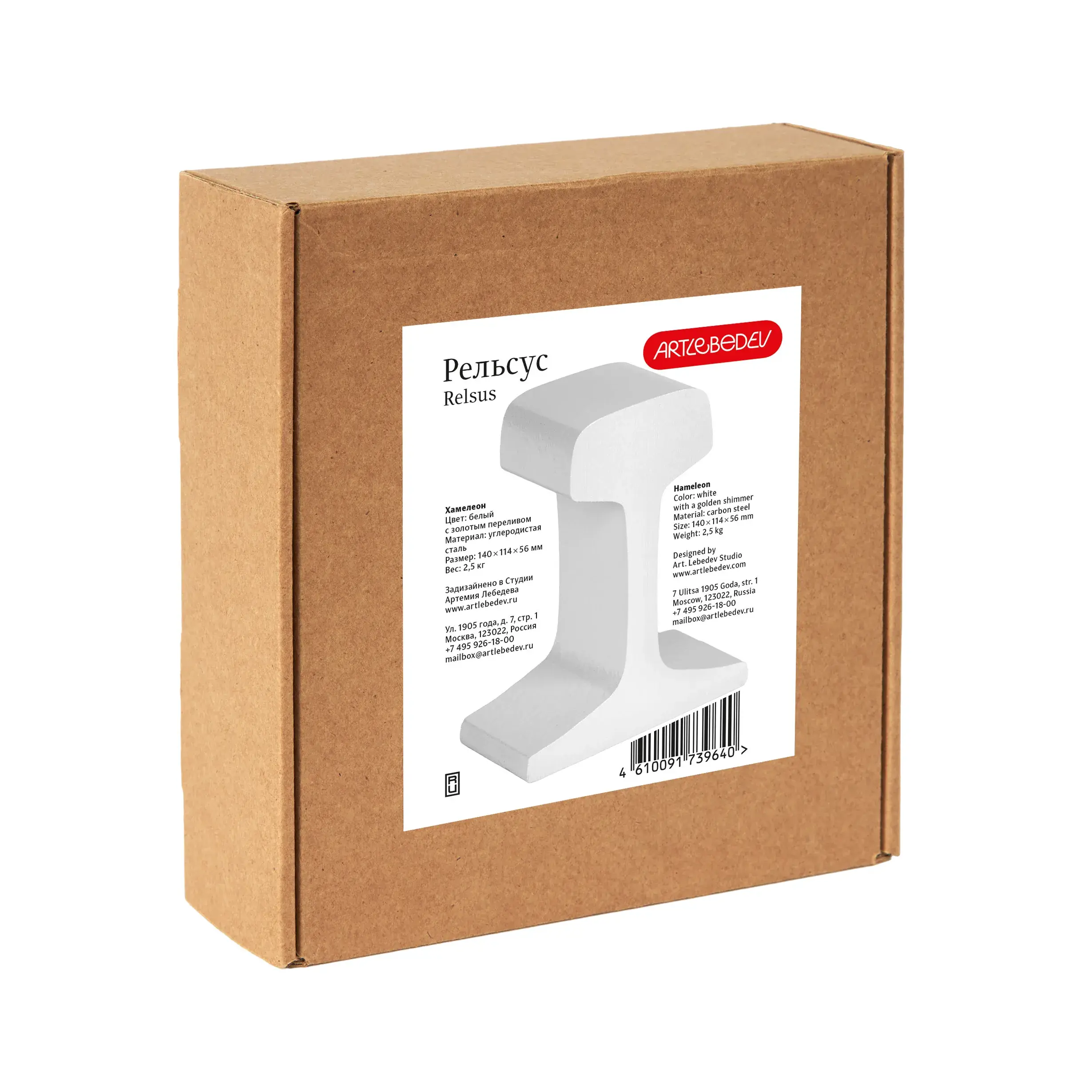 «Рельсус хамелеон» — настоящий кусок настоящего железнодорожного рельса типа Р43 из углеродистой стали весом два с половиной килограмма. Надежный и брутальный предмет, который всегда находит применение дома и в офисе: придавливает бумаги на столе, подпирает книги на полках, удерживает двери и помогает в любых ситуациях, когда нужно что-то основательно зафиксировать.
